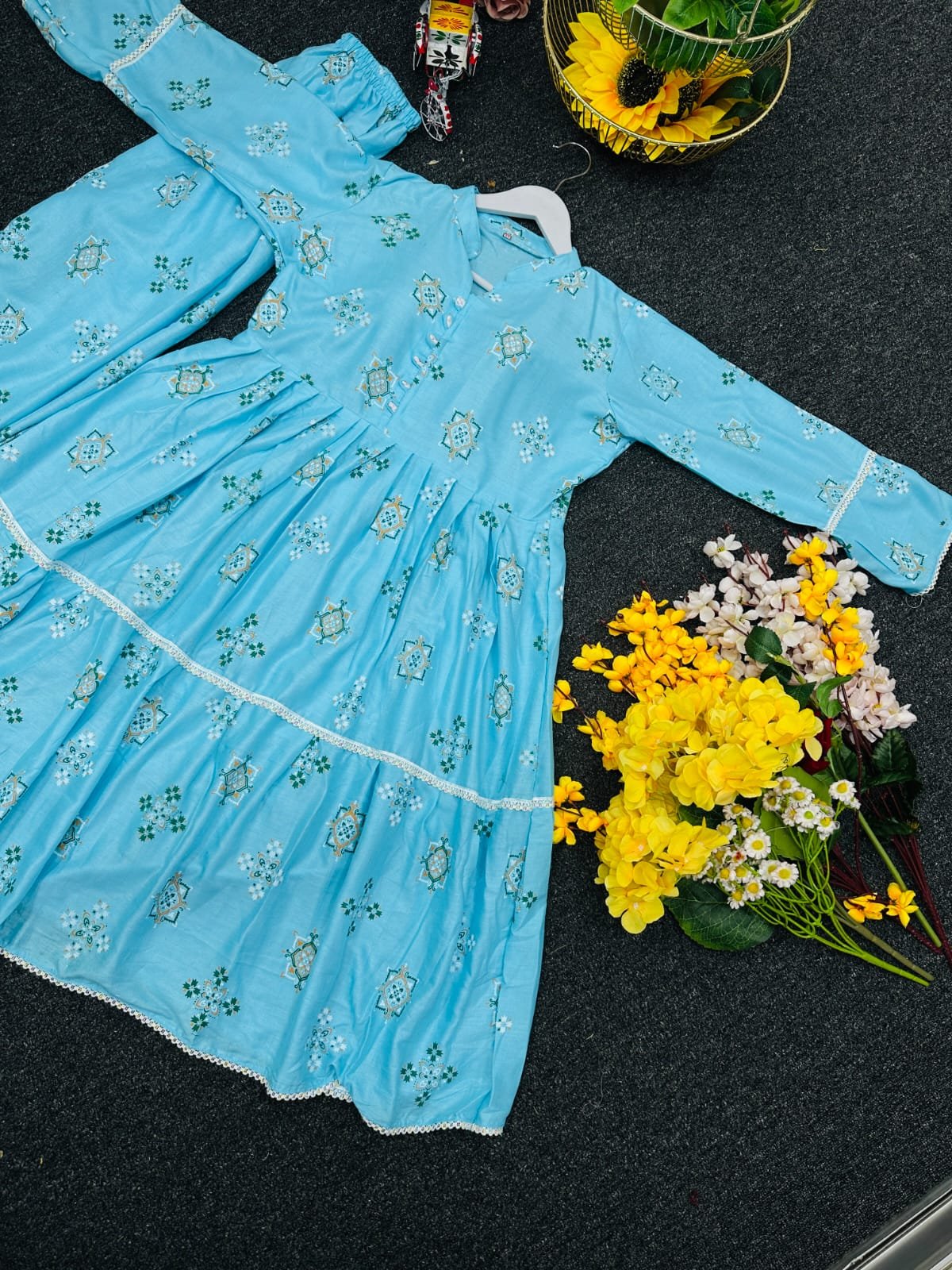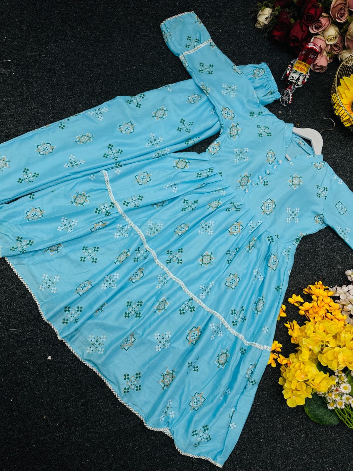 জামা:- ভিআইপি কটন কাপড়ের উপর স্কিন প্রিন্ট এর কাজ করা থাকবে, পুরো জামায় লেইস এর কাজ করা থাকবে। গলায় শো বাটন করা থাকবে।