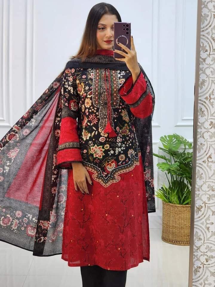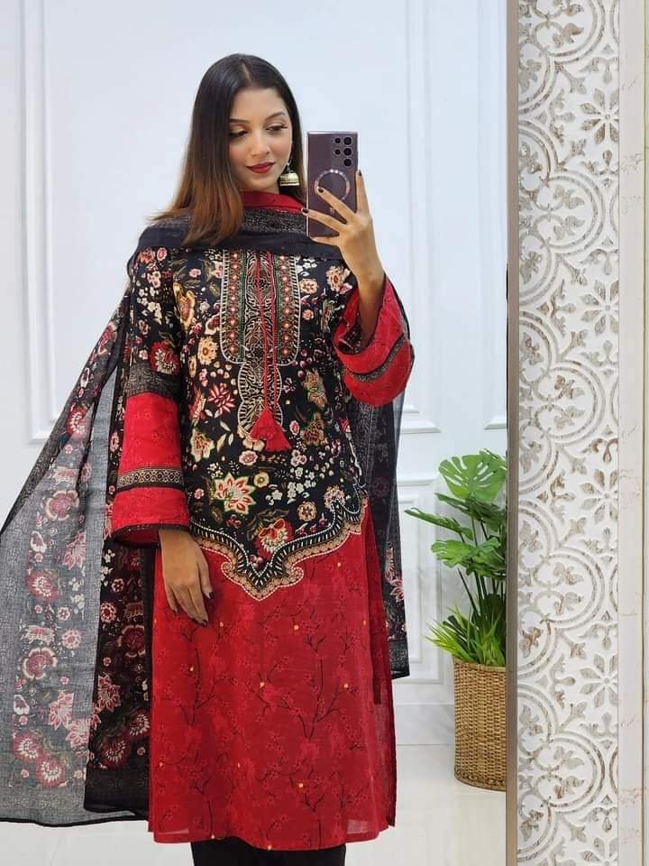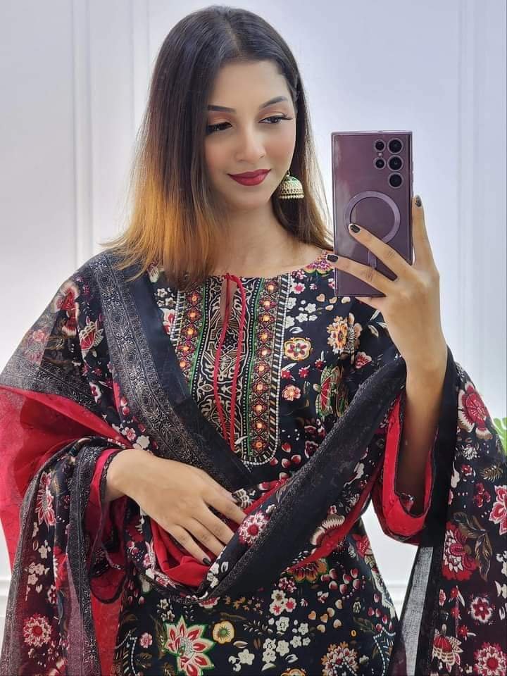 ” আন স্টিচড থ্রি পিস “ বডি :: সূতি কাপড় ডিজিটাল প্রিন্ট ও গলায় হাতে সেলাই সুতার কাজ। বডি লং :: ৪৯ ইঞ্চি। হাতা :: ২২ ইঞ্চি। ওড়না :: সুতি ডিজিটাল প্রিন্ট। ওড়না পাঁচ ছাত বহর হবে। সালোয়ার :: আড়াই গজ । বি: দ্র: পাকা রং।