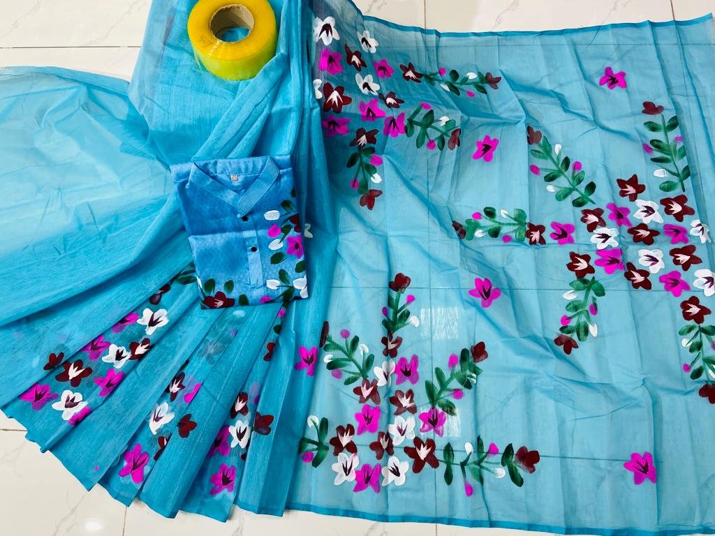 এক্সক্লুসিভ ট্রেডিশনাল হ্যান্ড প্রিন্ট কাপল সেট প্রোডাক্ট ডেসক্রিপশন:- হাফ সিল্ক শাড়ি। ধুপিয়ান সিল্ক পাঞ্জাবি। হ্যান্ড প্রিন্ট তুলির কাজ।  পাঞ্জাবি সাইজ-৪০,৪২,৪৪,৪৬ আধুনিক ও মান সম্মত ডিজাইন। অরিজিনাল প্রোডাক্ট।