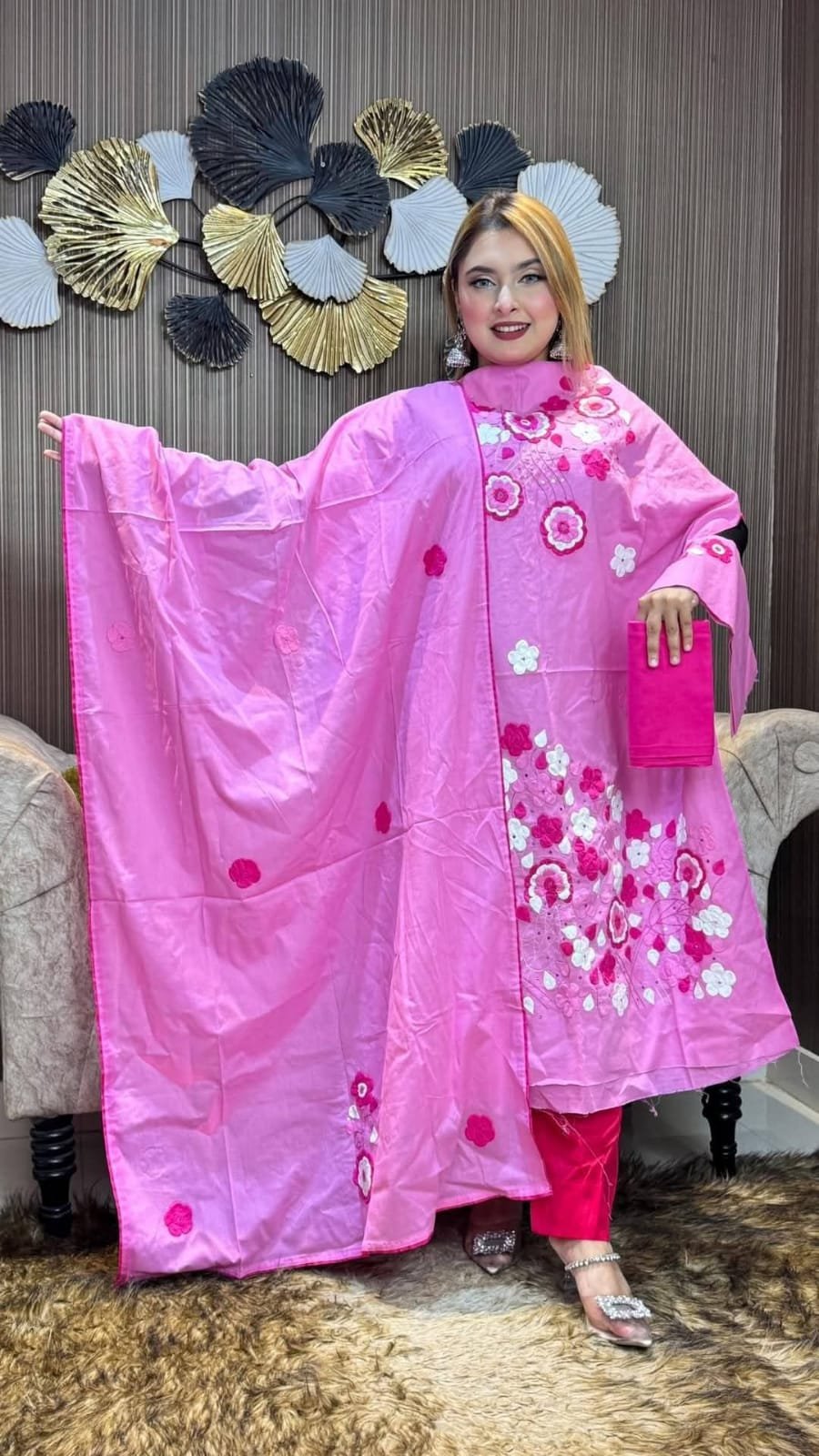 এ্যাপ্লিক কাজ করা থ্রি পিস ড্রেস সেলোয়ার 2.5গজ ওড়না 5হাত
