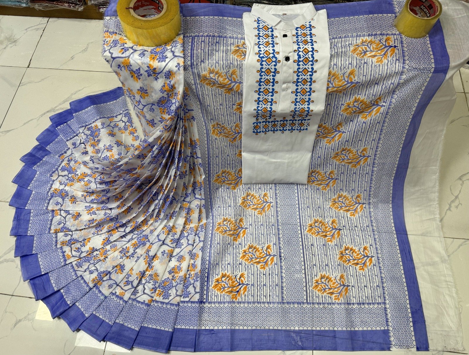 সাদা পাঞ্জাবি আর মানানসই শাড়ির কাপল সেট, যা একসাথে দেয় পরিপূর্ণতা, ঐতিহ্য আর ভালোবাসার স্পর্শ। এই সেট শুধু পোশাক নয়, এটা দু’জনের একসাথে সুন্দরভাবে ধরা দেওয়ার এক নিঃশব্দ স্টেটমেন্ট।