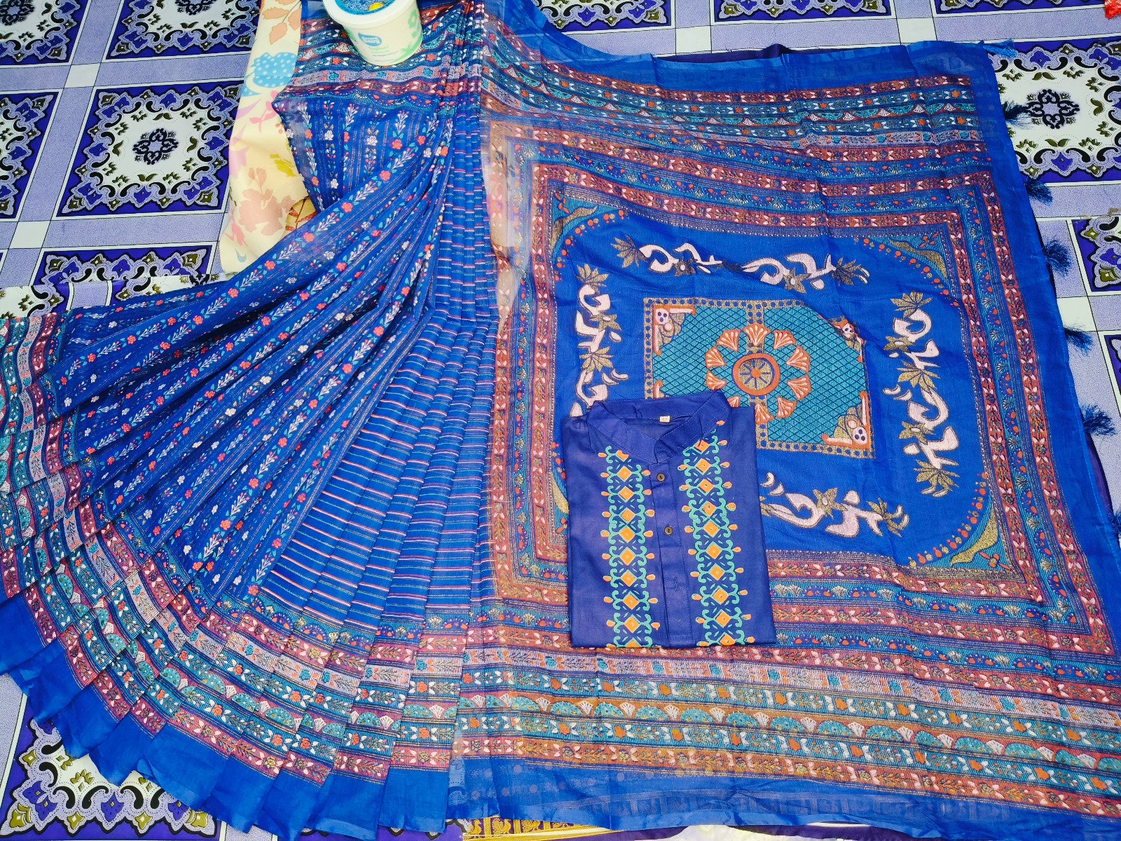 প্রিমিয়াম হাফসিল্ক শাড়ি এন্ড পাঞ্জাবি স্কিন প্রিন্টের কাজ করা শাড়ির সাথে ব্লাউজ নেই ধুপিয়ান সিল্ক পাঞ্জাবি পাঞ্জাবিতে ব্লক প্রিন্টের কাজ পাঞ্জাবি সাইজ ৩৮ থেকে ৪৬ কোয়ালিটি ফুল প্রোডাক্ট প্রিমিয়াম স্টাইলিশ কালেকশ