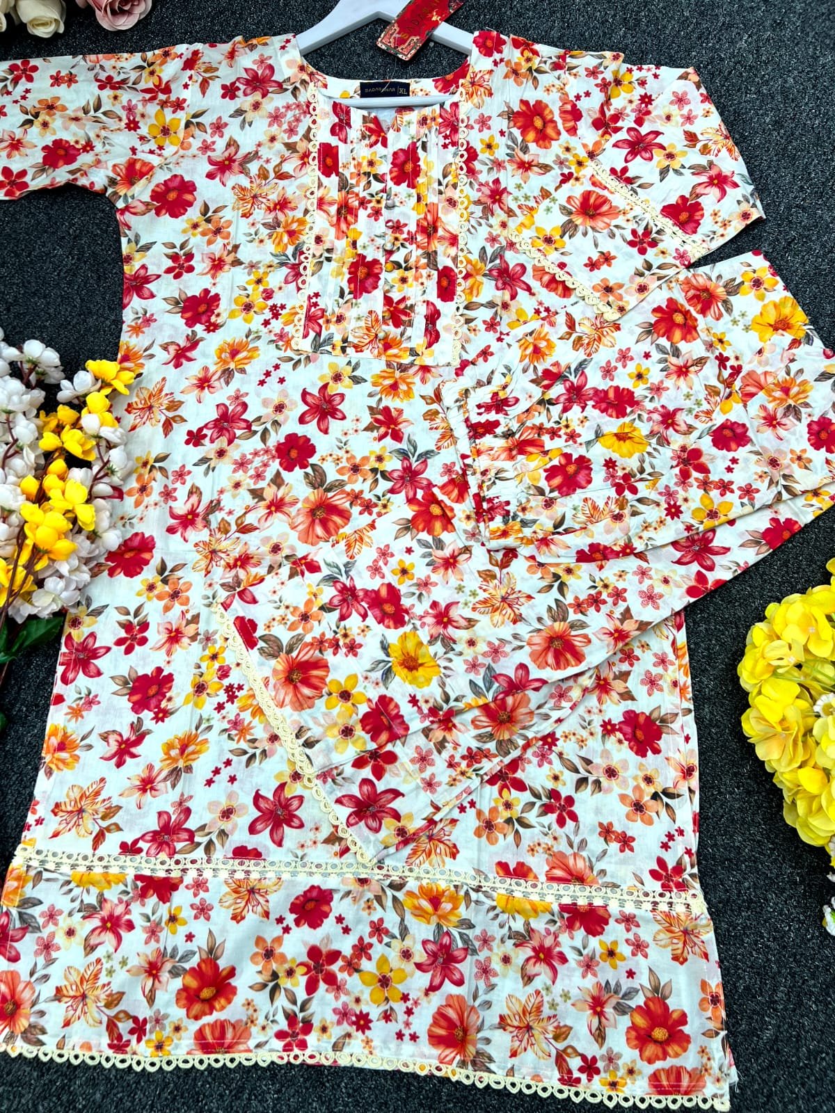 জামার বিবরণ:- সুতি কাপড়ের উপর ডিজিটাল প্রিন্ট এর কাজ করা থাকবে এবং কি লেইস এর কাজ করা থাকবে।