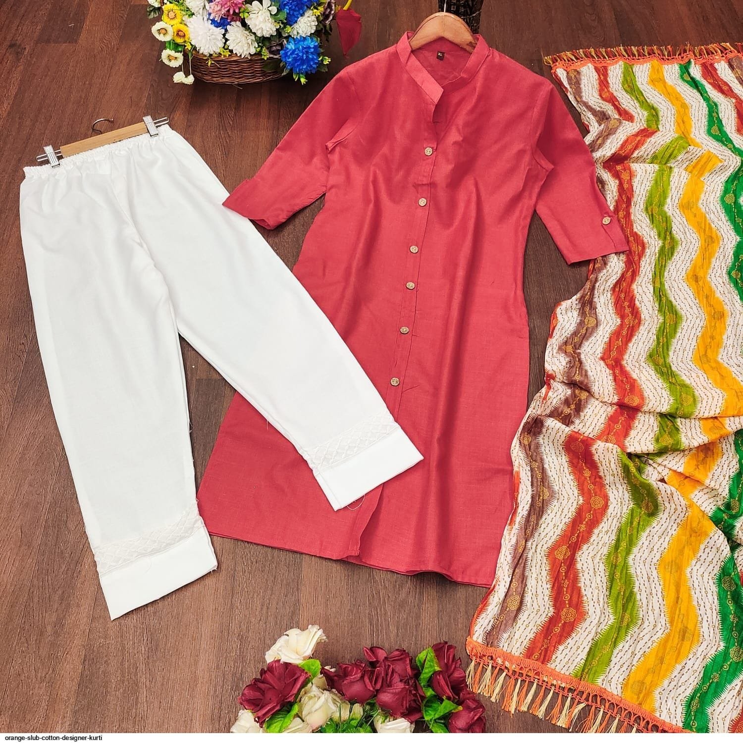 প্যান্টের বিবরণ:-ইন্ডিয়ান বাটার সিল্ক কাপড়ের সম্পূর্ণ সেলাই করা থাকবে প্যান্টের নিচে এমব্রয়ডারি কাজ করা থাকবে।। লং ৩৮,, কোমর ফ্রি সাইজ।
