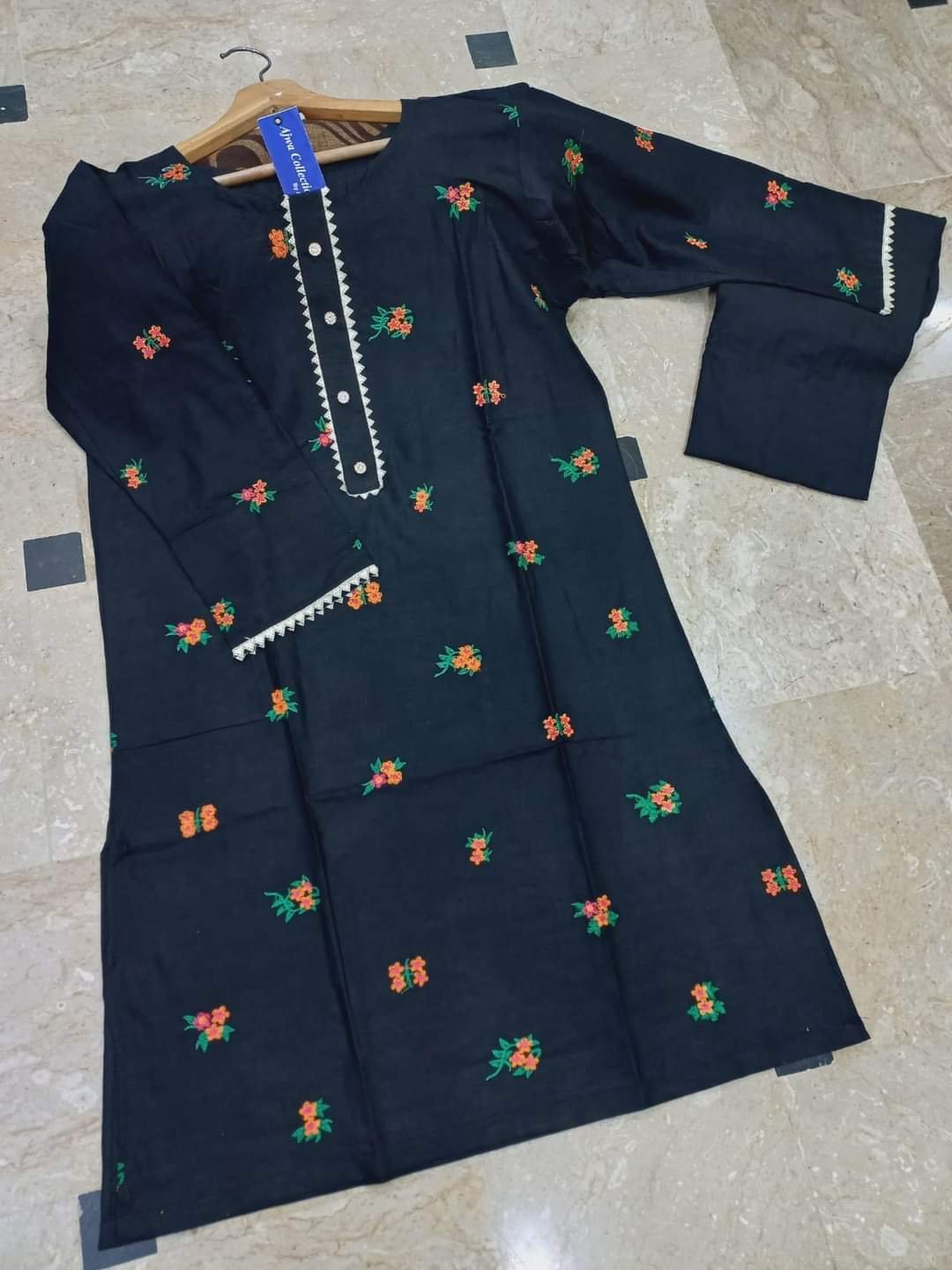 জামা :- VIP লিলেন কাপড়,,ফ্রী সাইজ, 44 পর্যন্ত পড়তে পারবে।।।জামার লং:-44/45,,,, ফুল বডিতে কম্পিউটার এমব্রয়ডারি কাজ করা থাকবে গলায় এবং হাতায় লেস এবং বাটন লাগানো থাকবে।।
