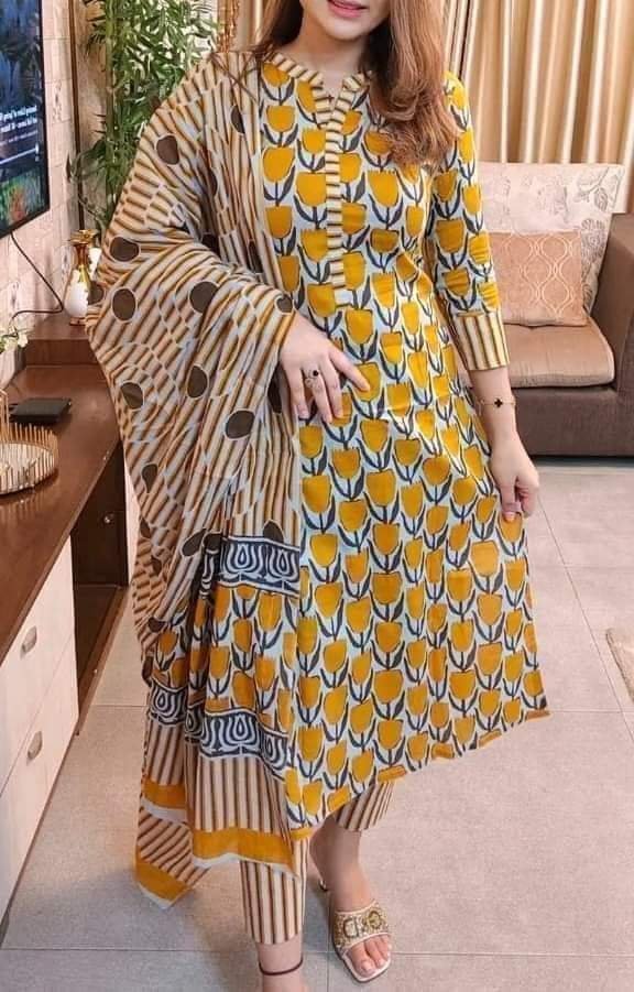 হাই কোয়ালিটি কটন স্কিন প্রিন্ট থ্রীপিস কামিজ কটন সেলোয়ার: কটন ২.৫ গজ ওড়না:কটন ৫.৫ হাত।