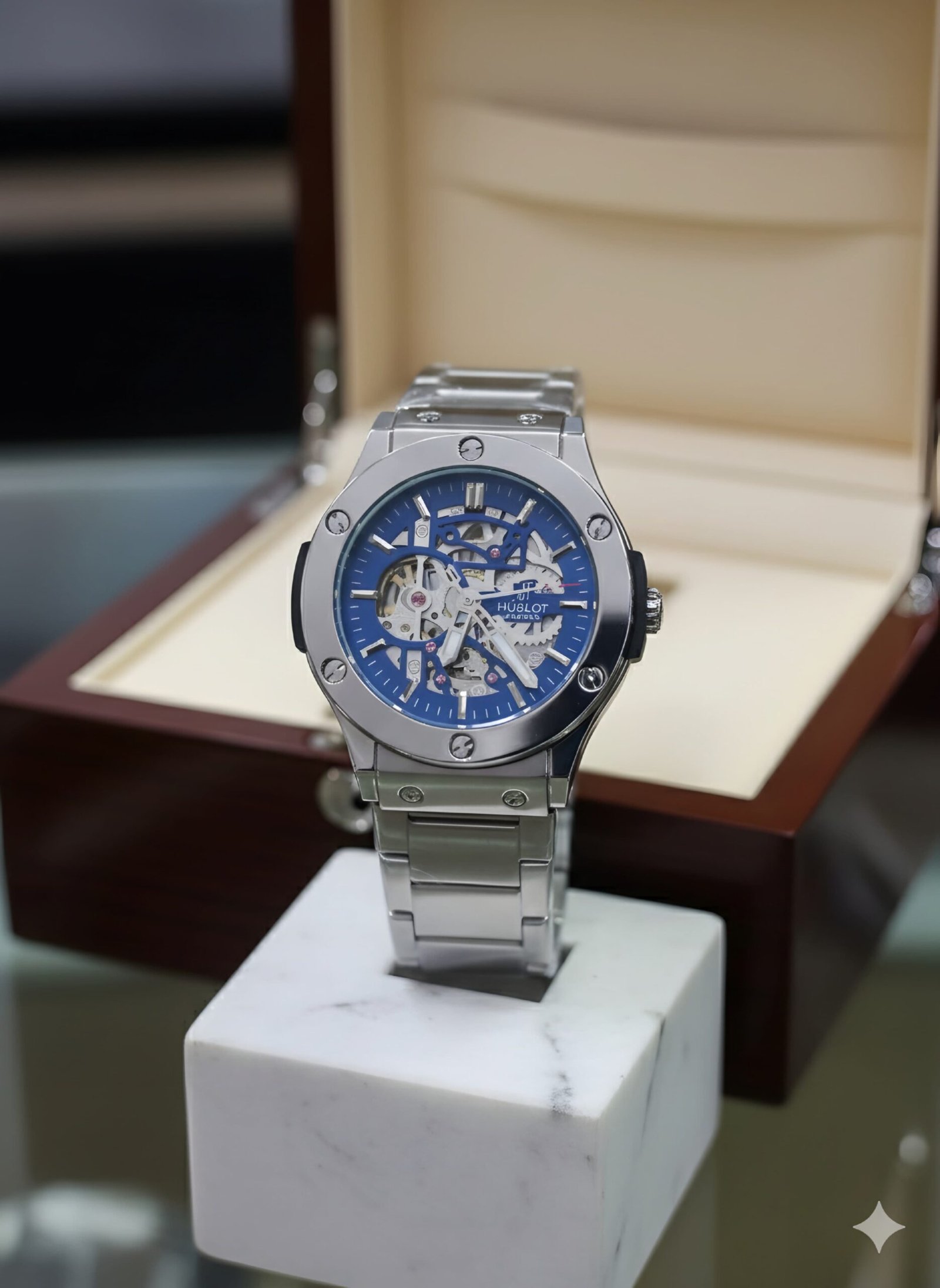 ⚙️ স্কেলিটন ডায়াল: ঘড়ির ভেতরের গিয়ার বা মেকানিজম সরাসরি দেখা যায়, যা একে দিয়েছে এক রাজকীয় এবং মেকানিক্যাল লুক।
