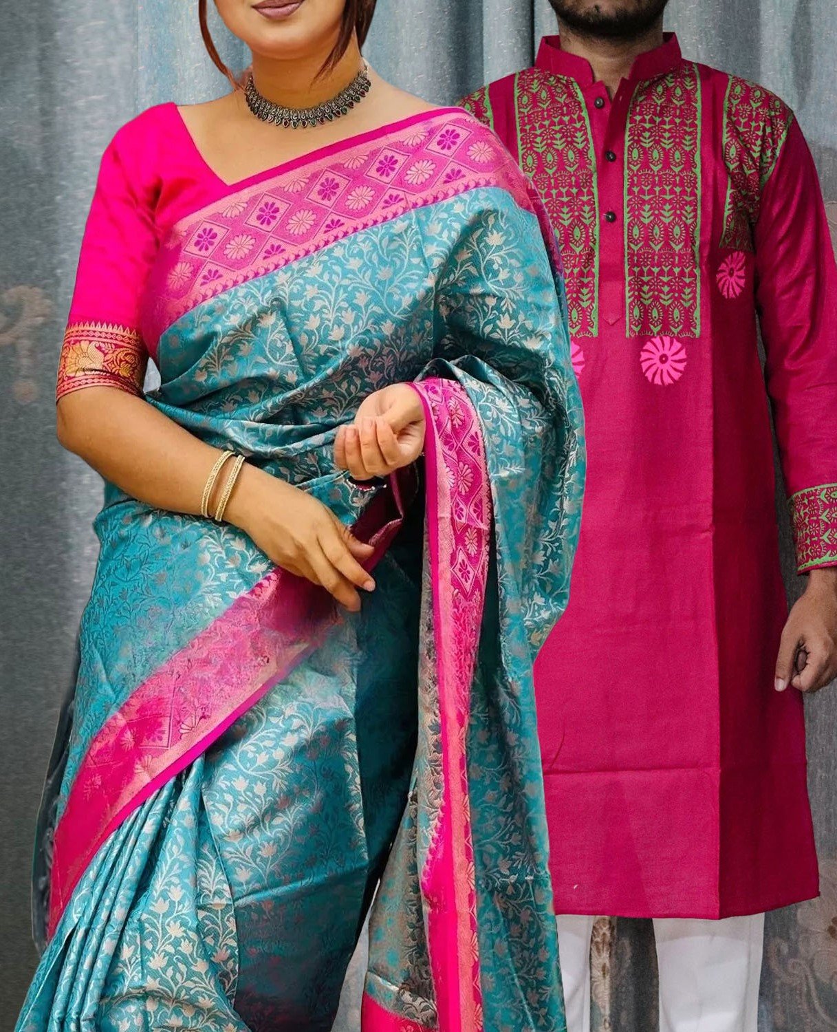 💕 একটা ক্লাসি কাতান শাড়ি, আর সাথে মানানসই পাঞ্জাবি, দুজনের সাজে থাকুক একসাথে হঠাৎ করে চোখে পড়া মিল। উৎসব হোক বা ছবি তোলার দিন, আমাদের কাপল ড্রেসে থাকছে স্টাইল, কমফোর্ট আর একটুখানি ভালোবাসার ছোঁয়া।এক রঙ,এক ছন্দ, আপনাদের মতো জুটির জন্যই বানানো।
