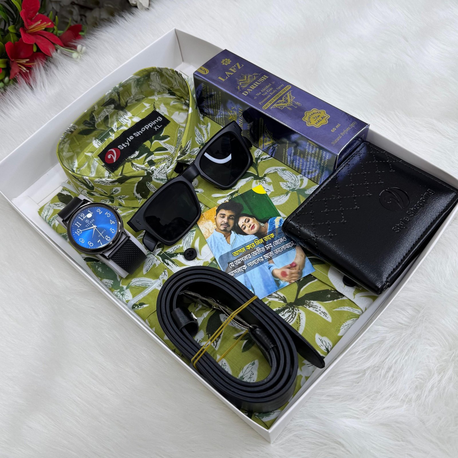 ফুল শার্ট কম্বো প্যাকেজ ১/শার্ট ২/ঘড়ি ৩/মানিব্যাগ ৪/পারফিউম ৫/সানগ্লাস ৬/বেল্ট ৭/গিফট কার্ড ৮/ব্ক্স