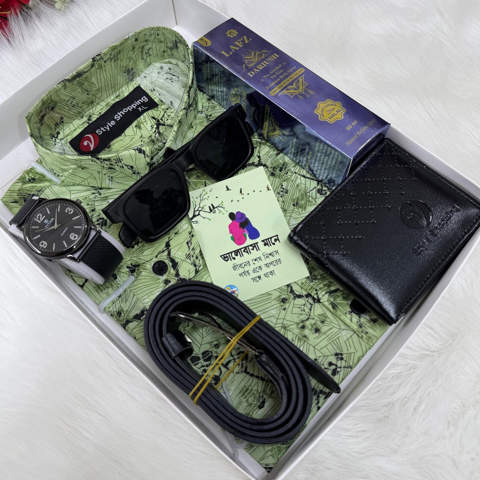 ফুল শার্ট কম্বো প্যাকেজ ১/শার্ট ২/ঘড়ি ৩/মানিব্যাগ ৪/পারফিউম ৫/সানগ্লাস ৬/বেল্ট ৭/গিফট কার্ড ৮/ব্ক্স