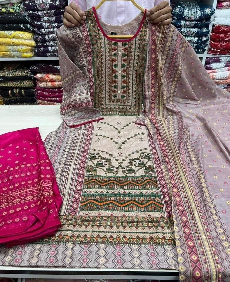রেডিমেড কটন বুটিক থ্রি পিস ফেব্রিক্স বডি:-স্যামসাং কটন। বডির মধ্যখান ও প্যানেলে এমব্রয়ডারি সিকুয়েন্স কাজ করা, ফুল বডিতে স্কিন প্রিন্ট করা 100%কালার গ্যারান্টি সাইজ:-৩৮–৪৬ ওড়না :-রেওন কটন সেলোয়ার:- এসি কটন