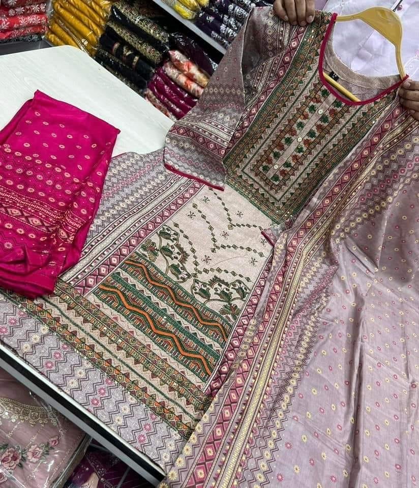 বডির মধ্যখান ও প্যানেলে এমব্রয়ডারি সিকুয়েন্স কাজ করা, ফুল বডিতে স্কিন প্রিন্ট করা 100%কালার গ্যারান্টি সাইজ:-৩৮–৪৬