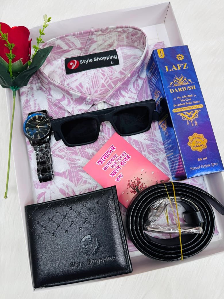 শার্ট কম্বো প্যাকেজ কম্বো প্যাকে যা যা থাকছে👇 ১/একটি ঘড়ি ২/একটি মানিব্যাগ ৩/একটি চশমা  ৪/একটি বেল্ট ৫/একটি পারফিউম  ৬/একটি গোলাপ  ৭/ একটি কার্ড সাথে একটি বাক্স  সাইজ-M-40/L-42/XL-44