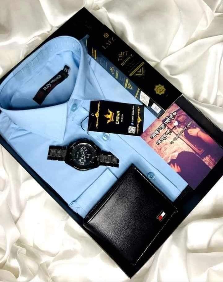 Exclusive Gift Combo Set পাকেজে যা যা থাকবেঃ -একটি শার্ট -একটি ঘড়ি -একটি মানি ব্যাগ -একটি বডি স্প্রে -একটি গিফট চিরকুট -বক্স সহ দেওয়া হবে। শার্ট এর সাইজঃ M: (Chest-38 inch, Length-28 inch) L: (Chest-40 inch, Length-29 inch) XL: (Chest-42 inch, Length-30 inch)