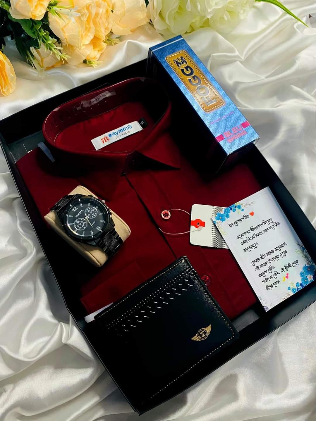 Exclusive Gift Combo Set পাকেজে যা যা থাকবেঃ -একটি শার্ট -একটি ঘড়ি -একটি মানি ব্যাগ -একটি বডি স্প্রে -একটি গিফট চিরকুট -বক্স সহ দেওয়া হবে। শার্ট এর সাইজঃ M: (Chest-38 inch, Length-28 inch) L: (Chest-40 inch, Length-29 inch) XL: (Chest-42 inch, Length-30 inch)