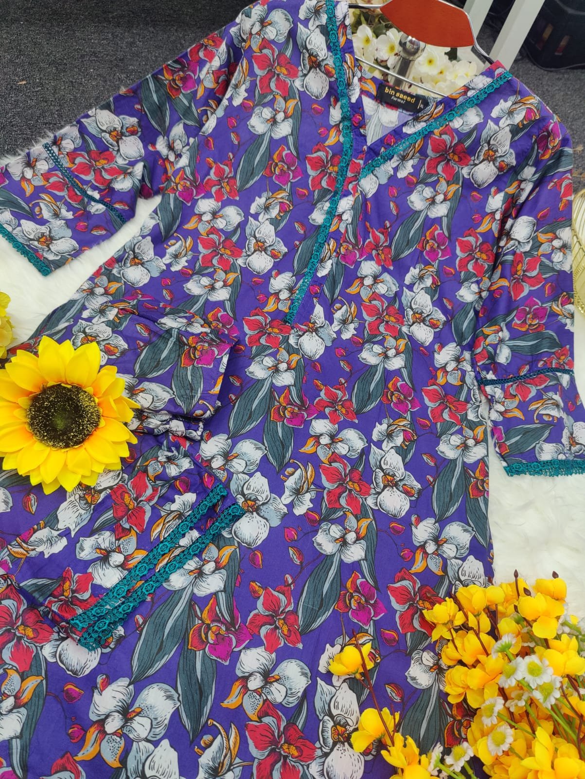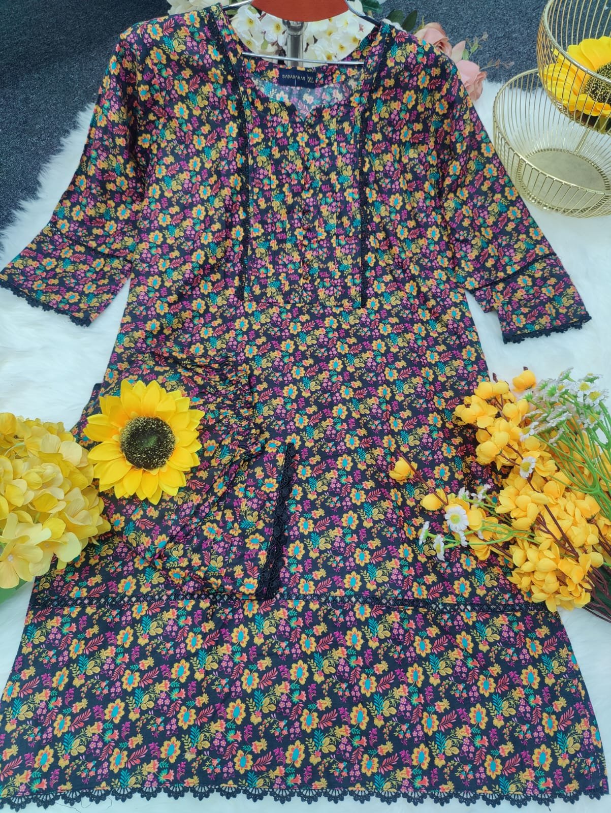 জামার বিবরণ:- সুতি কাপড়ের উপর ডিজিটাল প্রিন্ট এর কাজ করা থাকবে এবং কি লেইস এর কাজ করা থাকবে।