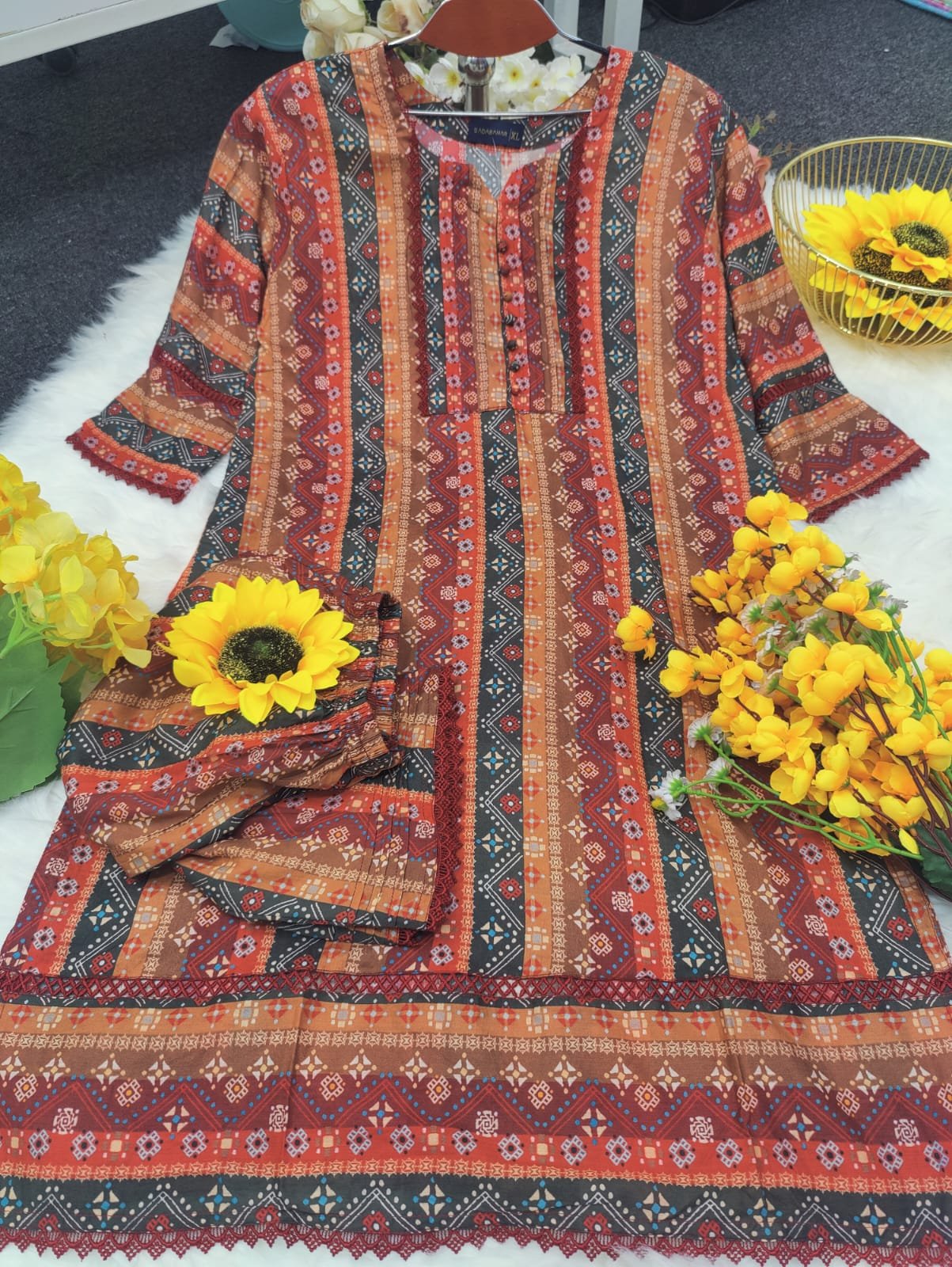 জামার বিবরণ:- সুতি কাপড়ের উপর ডিজিটাল প্রিন্ট এর কাজ করা থাকবে এবং কি লেইস এর কাজ করা থাকবে।