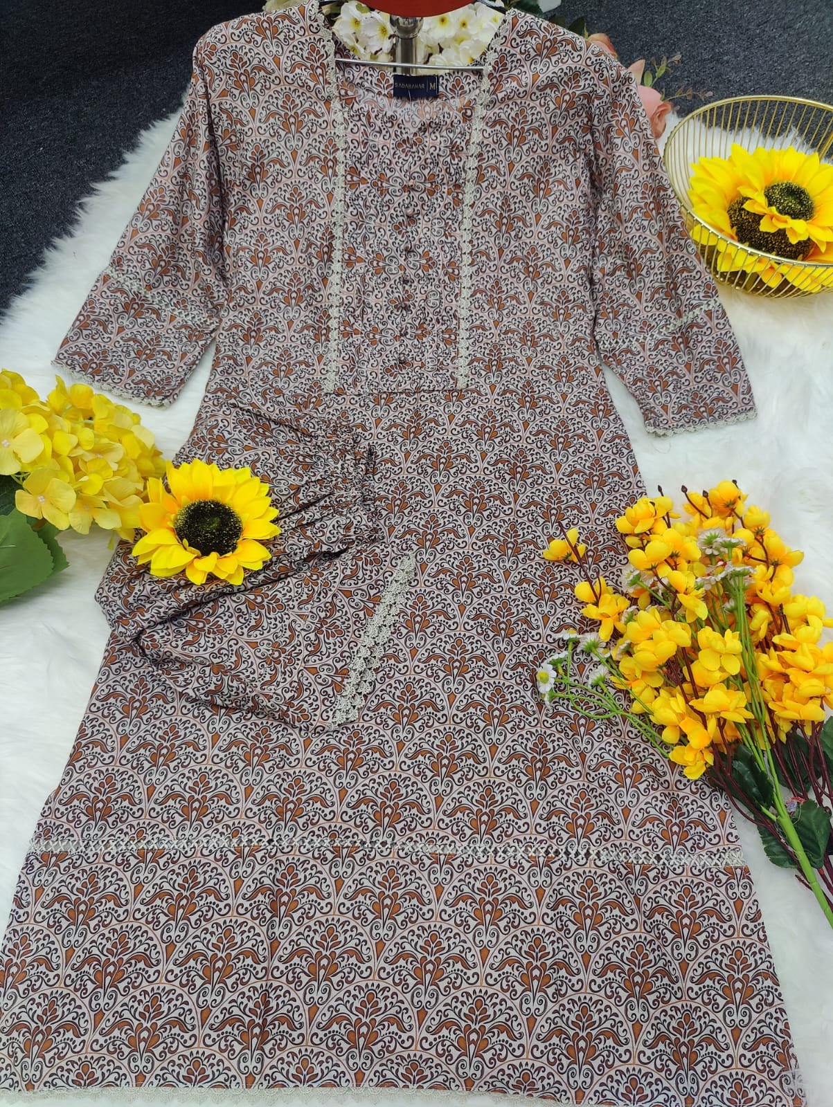 সেলোয়ার:- সেম প্রিন্ট এর কাজ করা এবং কি নিচে সুন্দর করে লেইস এর কাজ করা থাকবে ।