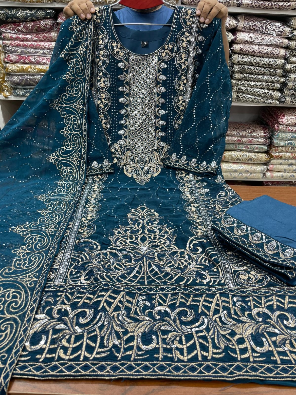★ readymade Georgette 4ps★ ★fabrics★ ★body –Indian white gold Georgette, ★orna– Indian white gold georgette. ★salwar & inner– topiter √√ heavy sequence and jari embroidery work.