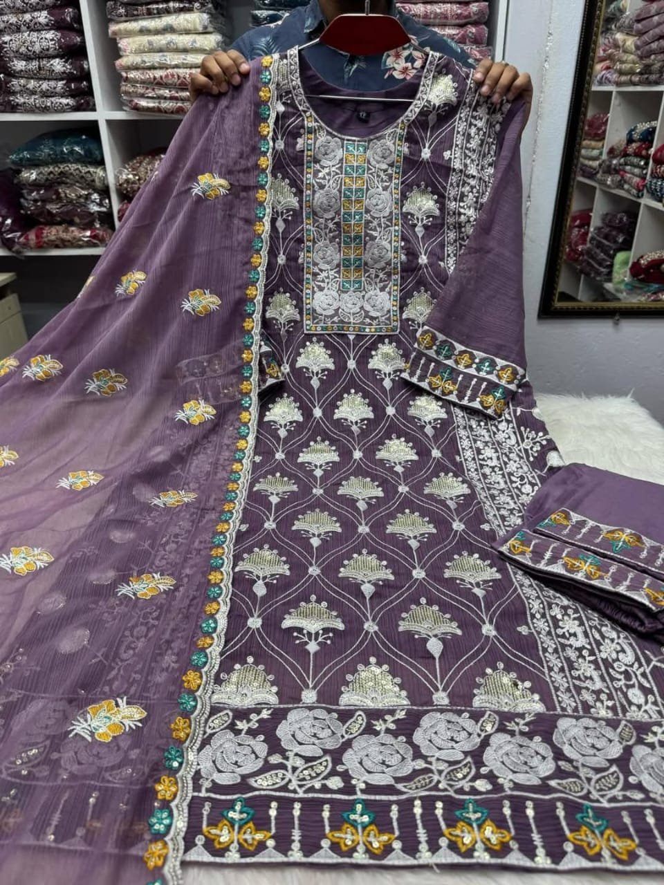 ★ readymade Georgette 4ps★ ★fabrics★ ★body –Indian white gold Georgette, ★orna– Indian white gold georgette. ★salwar & inner– topiter √√ heavy sequence and jari embroidery work.