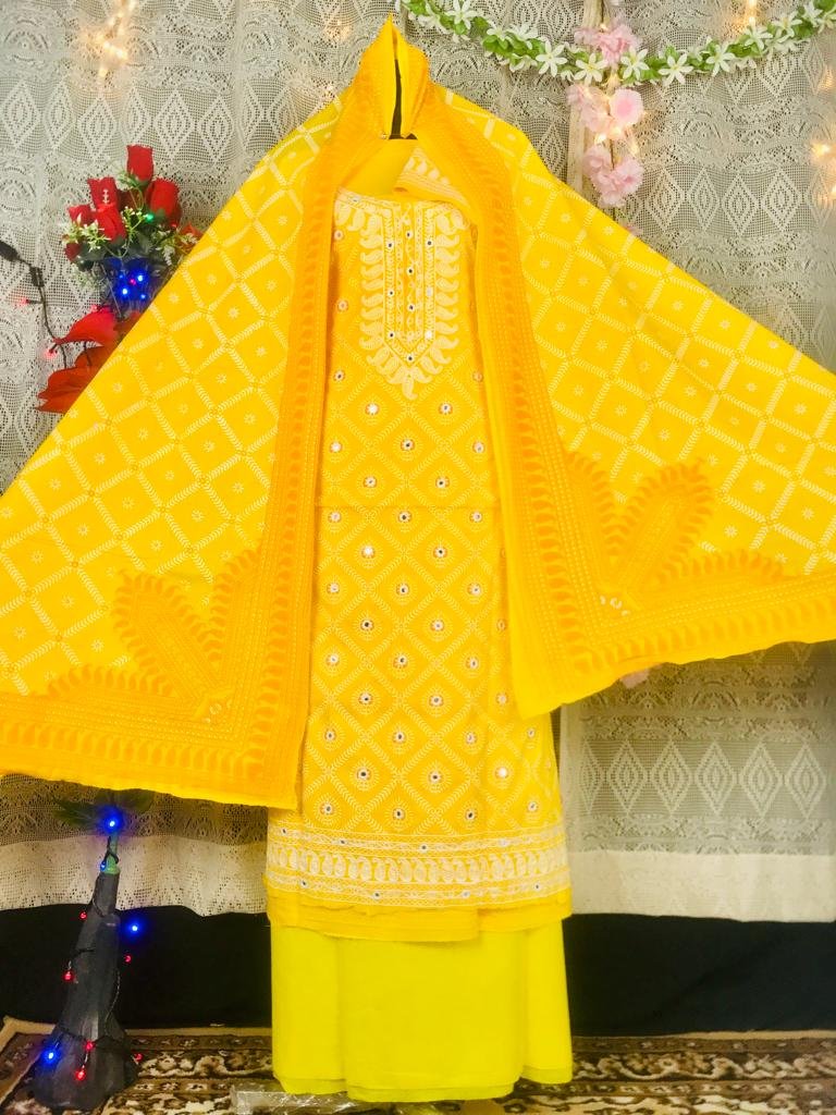 স্ক্রিন প্রিন্ট এর উপর আড়ি সুতার ডলারের কাজ করা থ্রি পিস কামিজ=ভয়েল কাপড় সেলোয়ার= ভয়েল কাপড় ওড়না=ভয়েল কাপড়