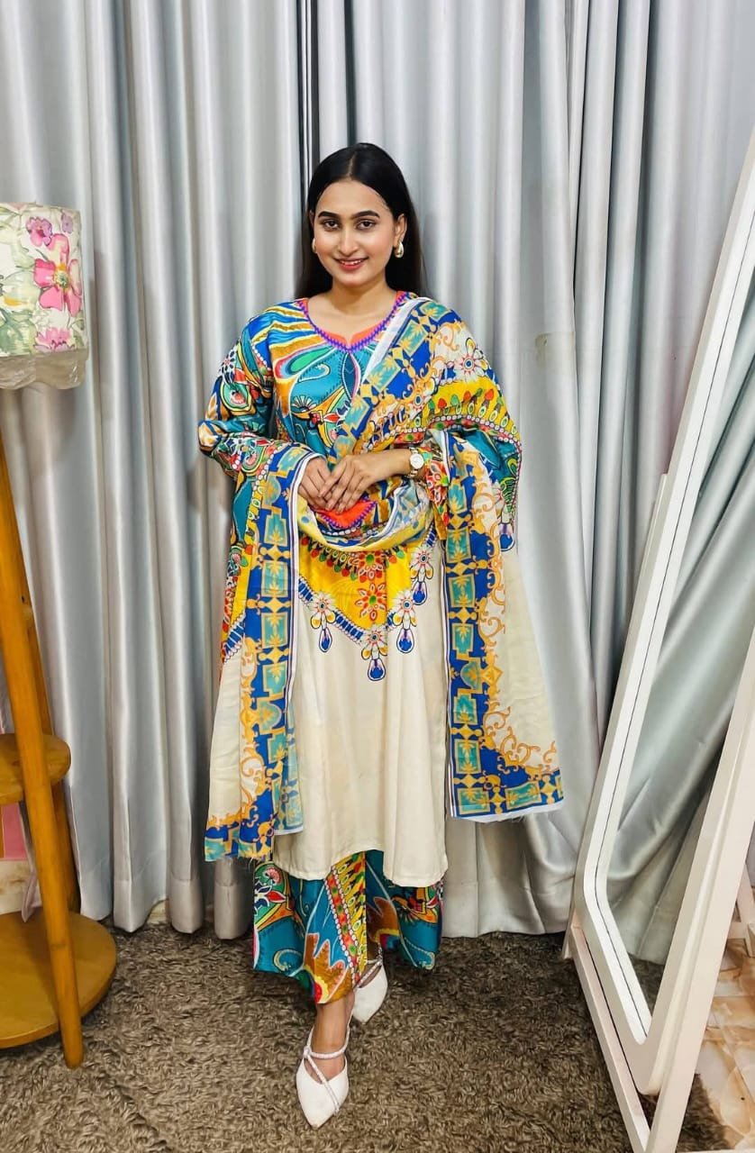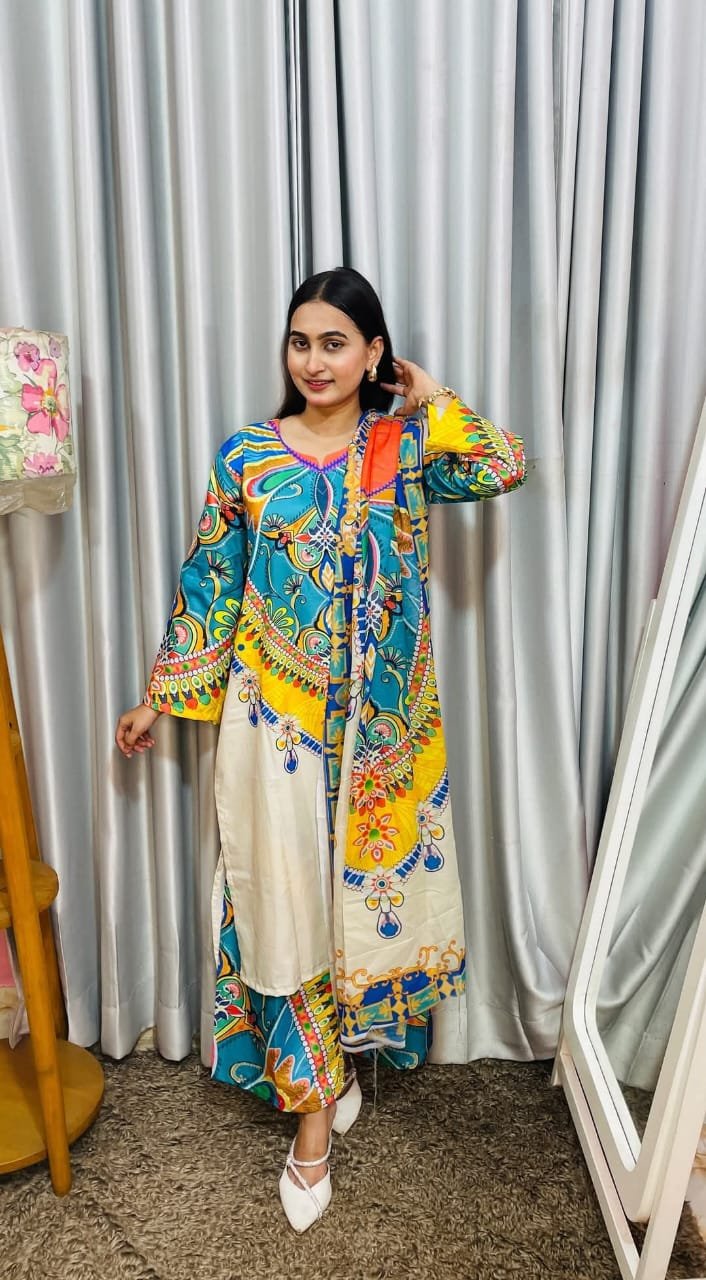Most demanding 3 pices Fabric details: Body:- soft silk kapor Digital print kora Seloar -soft silkkapor Digital print kora orna: Cotton kaporar opora Digital print kora Size-38-48