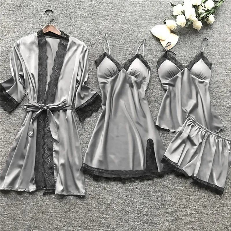Women Silk Pajama Set 4pcs Sexy Lace Trimmings Camisole Nightgown Summer Elegant Sleepwear Loungewear