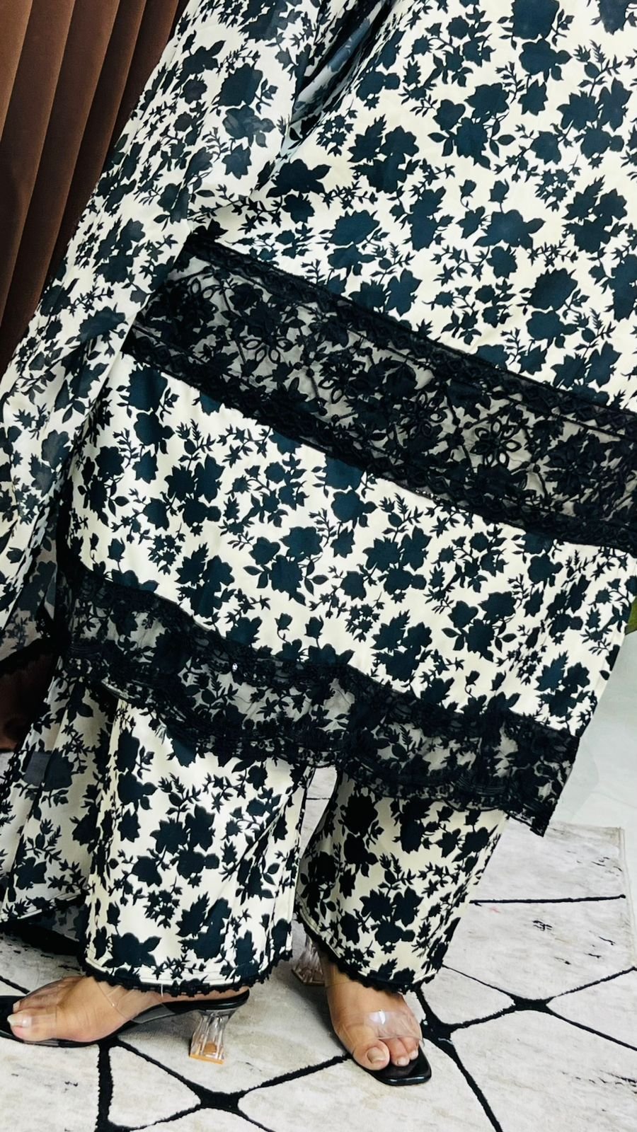 pakisthani inspired 3 pis body- maicro stich with dgtl print and heavy sicuenc work and ambro dari work seloar- maicro stich with dgtl print work and les work orna- pure jorjet with dgtl prit and 4 side les work size – M L Xl